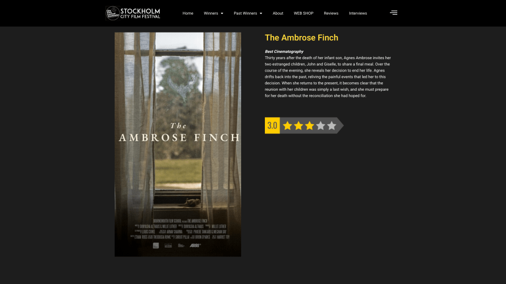 I am delighted to see The Ambrose Finch (2025) has won the Best Cinematography category at the Stockholm City Film Festival. The Ambrose Finch (2025) is the graduation film I camera operated on last year whilst studying at Arts University Bournemouth.
